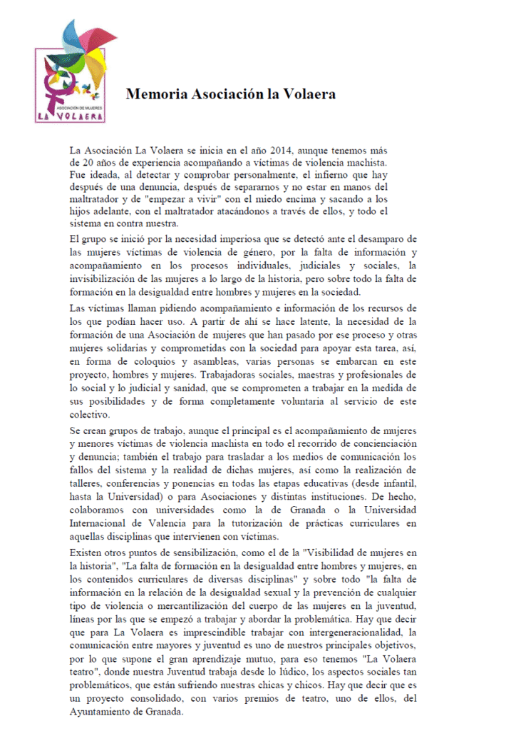 Existen otros puntos de sensibilización, como el de la «Visibilidad de mujeres en la historia», «La falta de formación en la desigualdad entre hombres y mujeres, en los contenidos curriculares de diversas disciplinas» y sobre todo «la falta de información en la relación de la desigualdad sexual y la prevención de cualquier tipo de violencia o mercantilización del cuerpo de las mujeres en la juventud, líneas por las que se empezó a trabajar y abordar la problemática. Hay que decir que para La Volaera es imprescindible trabajar con intergeneracionalidad, la comunicación entre mayores y juventud es uno de nuestros principales objetivos, por lo que supone el gran aprendizaje mutuo, para eso tenemos «La Volaera teatro», donde nuestra Juventud trabaja desde lo lúdico, los aspectos sociales tan problemáticos, que están sufriendo nuestras chicas y chicos. Hay que decir que es un proyecto consolidado, con varios premios de teatro, uno de ellos, del Ayuntamiento de Granada.