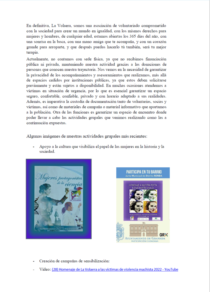 En definitiva, La Volaera, somos una asociación de voluntariado comprometido con la sociedad para crear un mundo en igualdad, con los mismos derechos para mujeres y hombres, de cualquier edad, estamos abiertas los 365 días del año, con una sonrisa en la boca, con una mano amiga que te acompaña, y con un corazón grande para arroparte, y que después puedas hacerlo tú también, será tu mejor terapia.